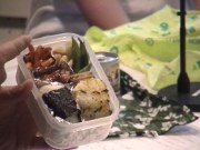 そして、三角堂の曲を1曲はさんで、「ザ・対決、三角一本勝負」のコーナー。今回のお題は、「お弁当対決」。春さん、流さんの手作りお弁当が披露されました。今回の審査員は会場に応援に来られていた方の中から、ジャンケン対決で選ばれた2人(かおりんさん・まゆちゃん)。審査員の2人は、スタジオに入り実際にお弁当を試食して、その優劣を審査しました。さて、その結果は??